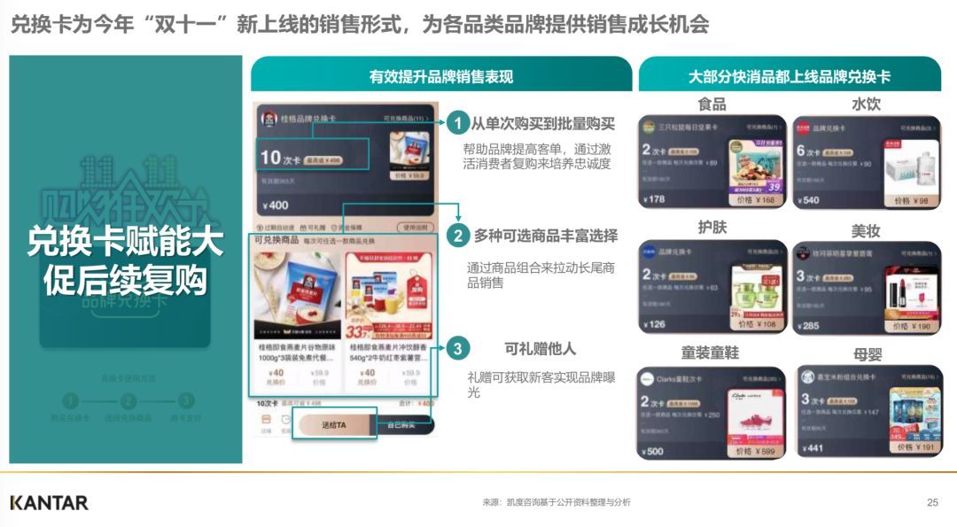 “兑换卡”则是今年双11新上线的销售形式,帮品牌方实现了从单次购买到批量购买、从单品到商品组合、从短期到长尾销售,协助品牌方提升了大促后的持续复购。2020年的兑换卡玩法,也将从快消走向更多品类。