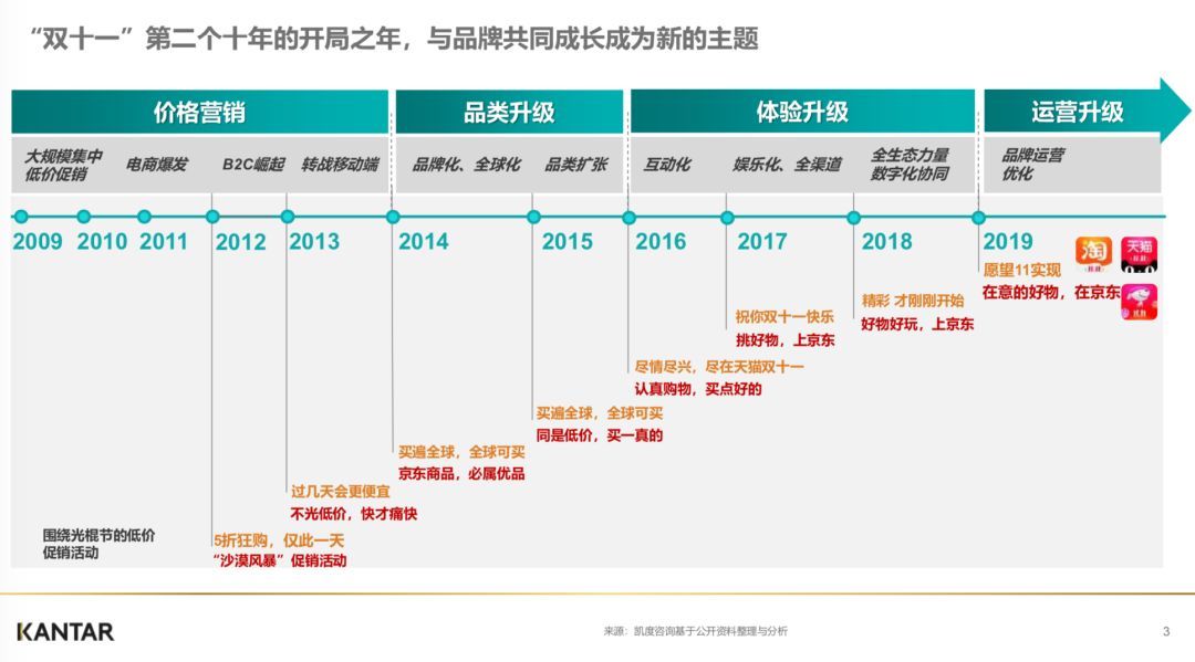 本次双11是阿里和京东品牌化运营的第一年。在此之前阿里双11(京东类似)已经走过了价格营销、品类升级、体验升级的三个阶段,每个阶段都是2到3年的小周期。