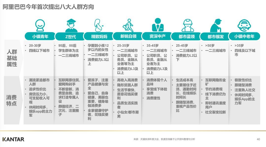 如果说以资深白领(包含精致妈妈)、新锐白领为代表的人群是目前的“中坚力量”,那么以Z世代和小镇青年为代表的人群就是正在爆发的“新势力”,都市银发、小镇中老年人群则是蓝海市场。