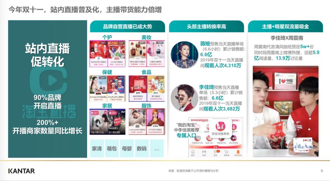 需要特别提出的是直播。本次双11天猫站内90%品牌开启了直播,开播商家数量同比增长200%以上,个护、美妆、保健、食品、家居、服饰行业的品牌方自营主播已成趋势。当然转化最高的是头部主播。