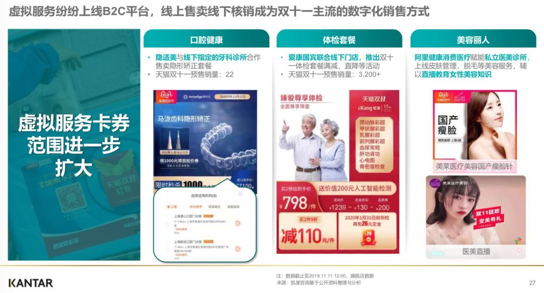 口腔健康、体检套餐、美容丽人等服务行业,在双11期间大量采取异业合作、知识分享的形式,线上销售线下核销的方式,虚拟服务卡券的应用范围进一步扩大。