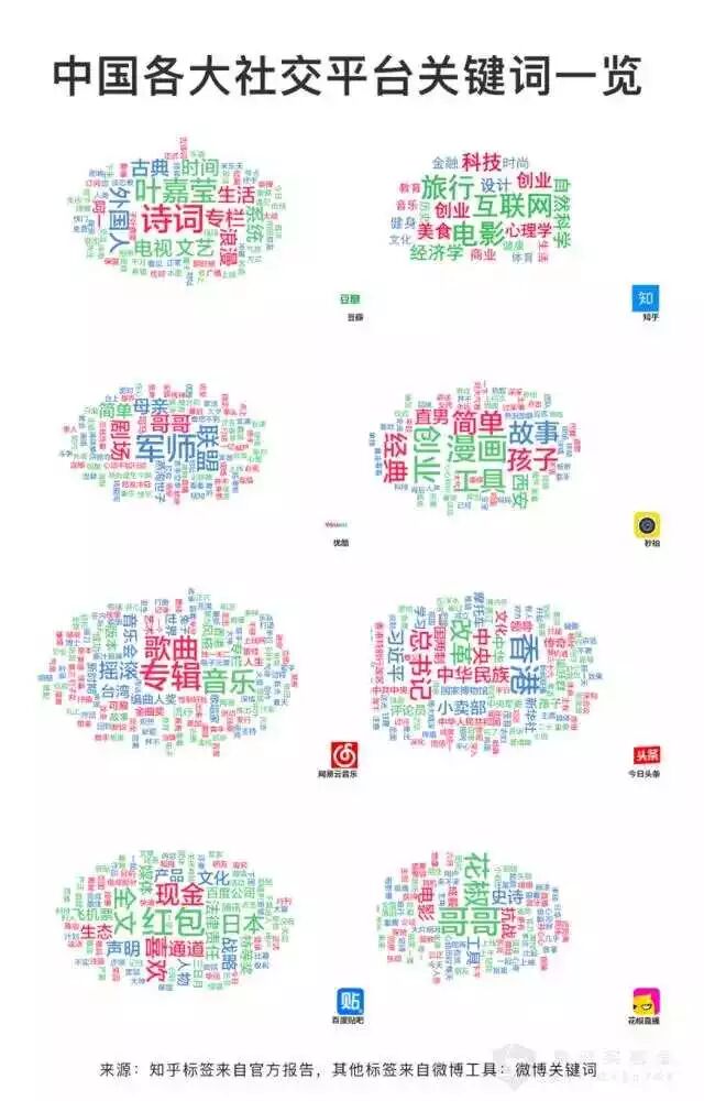 如果一个社交网站是一个城市,那么这些城市的公民的身份,特点,爱好都有所不同,不同的品牌就需要针对的自己的需求到合适的“城市”进行宣传。如果给这些平台一些关键词和标签,展示在我们面前大概是这样的。